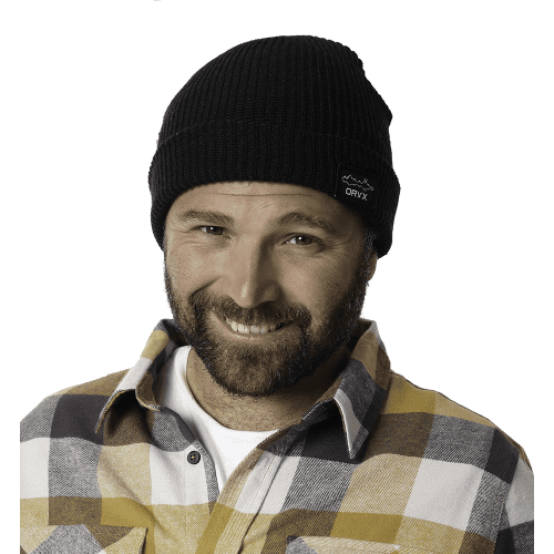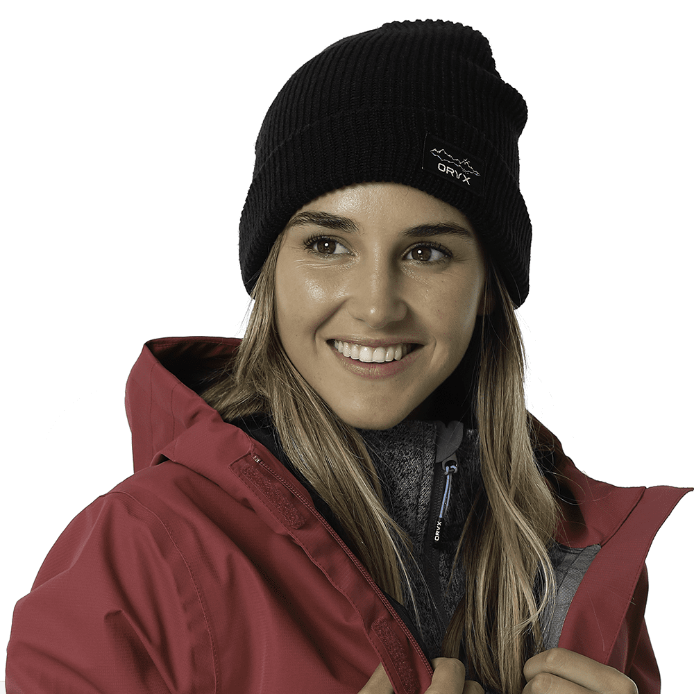 Gorro Beanie Zion Negro fabricado con 100% de poliester reciclado con etiqueta ORYX tejida.